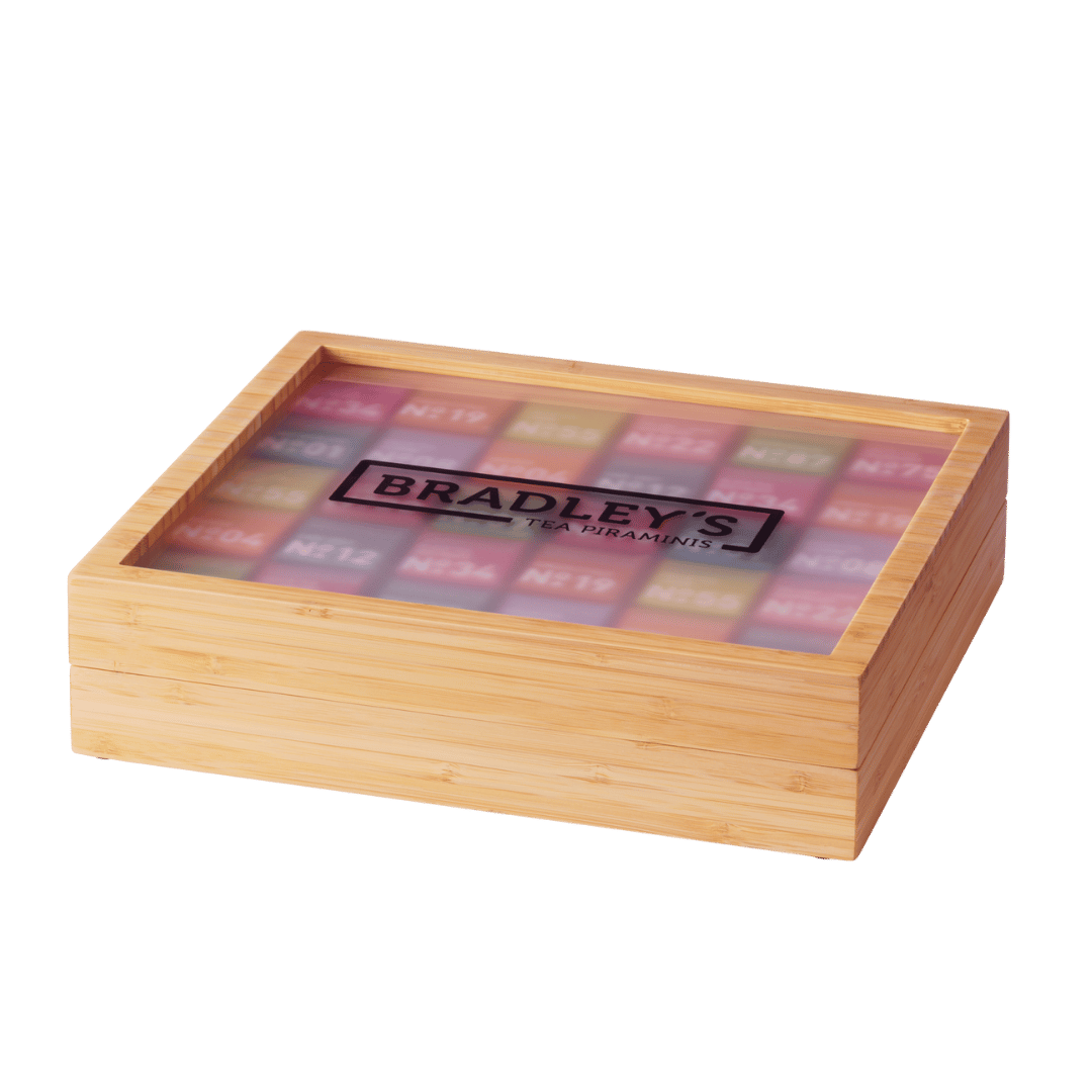 Ontdek de stijlvolle Bradley’s bamboe theekist met 30 vakken – de perfecte oplossing voor het organiseren en presenteren van Bradley’s Piraminis in het restaurant. Gemaakt van duurzaam bamboe, biedt deze ruime theedoos plaats aan 30 verschillende Piraminis, waardoor je gemakkelijk kunt variëren. Ideaal voor in het restaurant of op het terras.